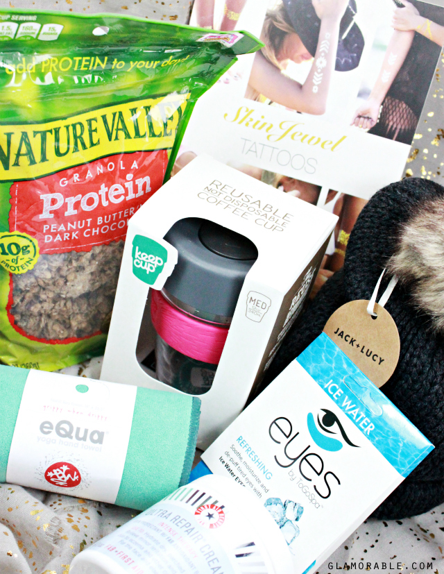 To sum up my thoughts on this box: everything was awesome, although some products were not season-appropriate. Loved the cup, the cream, the eye patches, and the granola; the hat and the towel were okay, I could have lived without them, and finally the blingy tattoos are probably best worn in the Summer. Overall, a solid A- box.